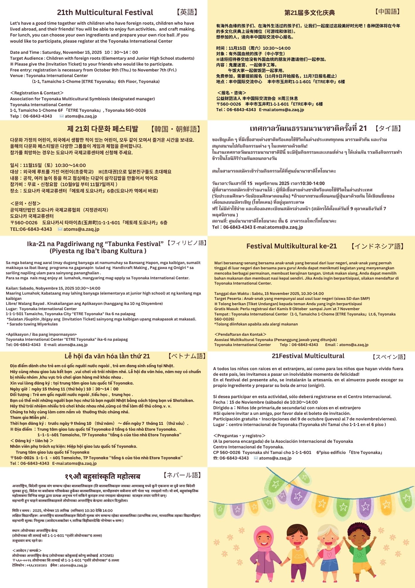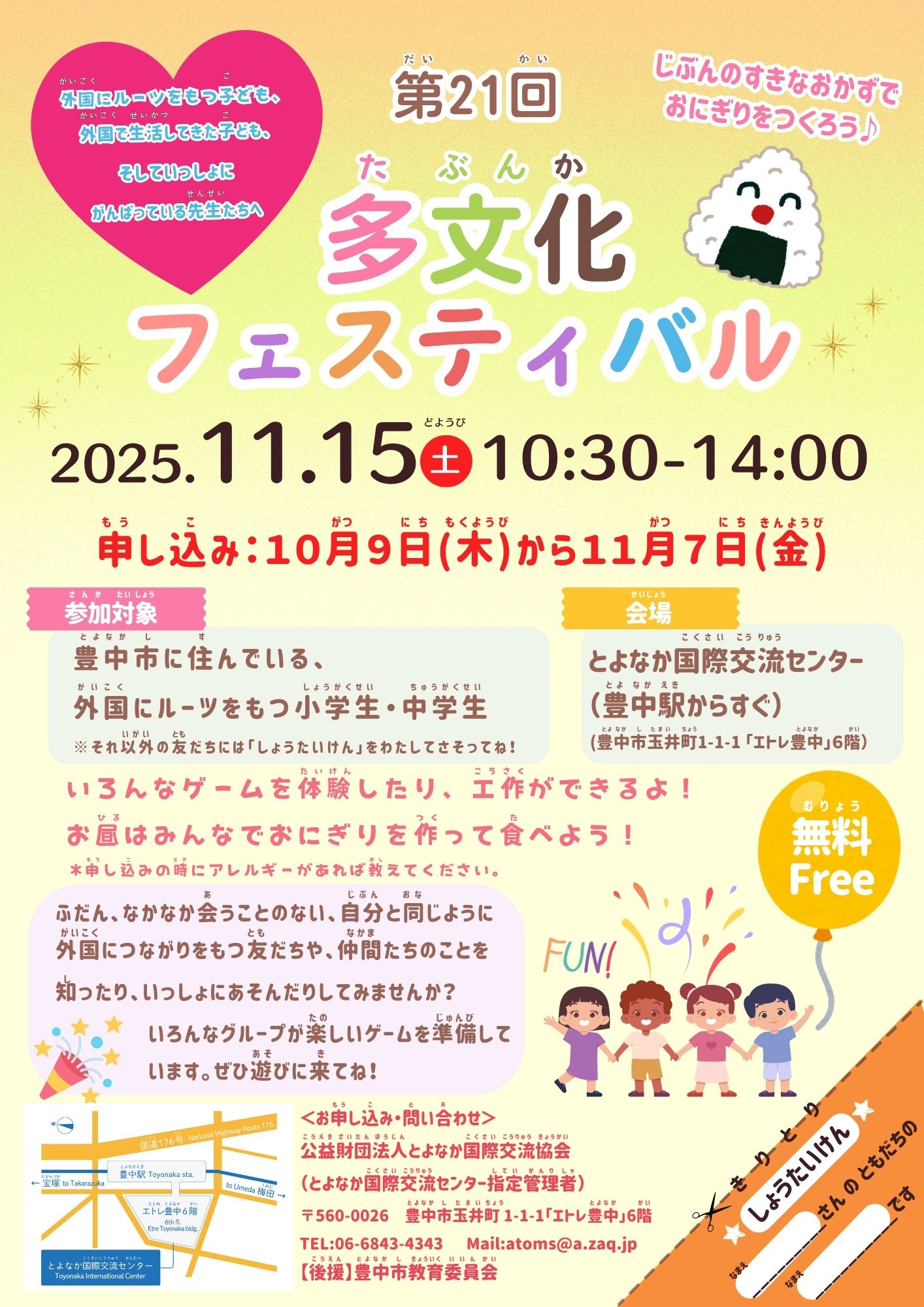 | 連絡先 | 公益財団法人とよなか国際交流協会(指定管理者) 電話:06-6843-4343 Mail:atoms@a.zaq.jp |