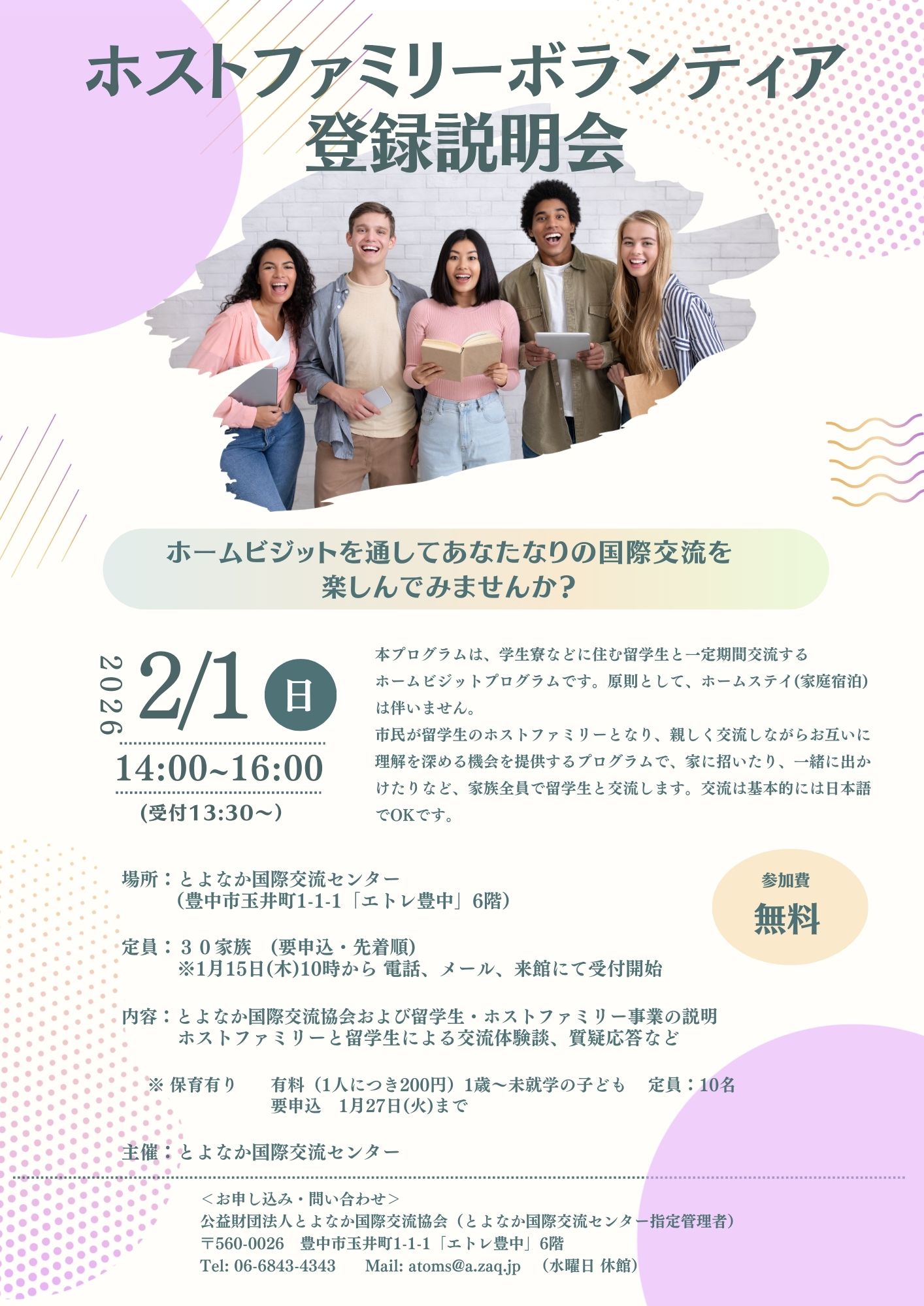 | 連絡先 | 公益財団法人とよなか国際交流協会(とよなか国際交流センター指定管理者) 〒560-0026 豊中市玉井町1-1-1「エトレ豊中」6階 Tel: 06-6843-4343 Mail: atoms@a.zaq.jp (水曜日 休館) |