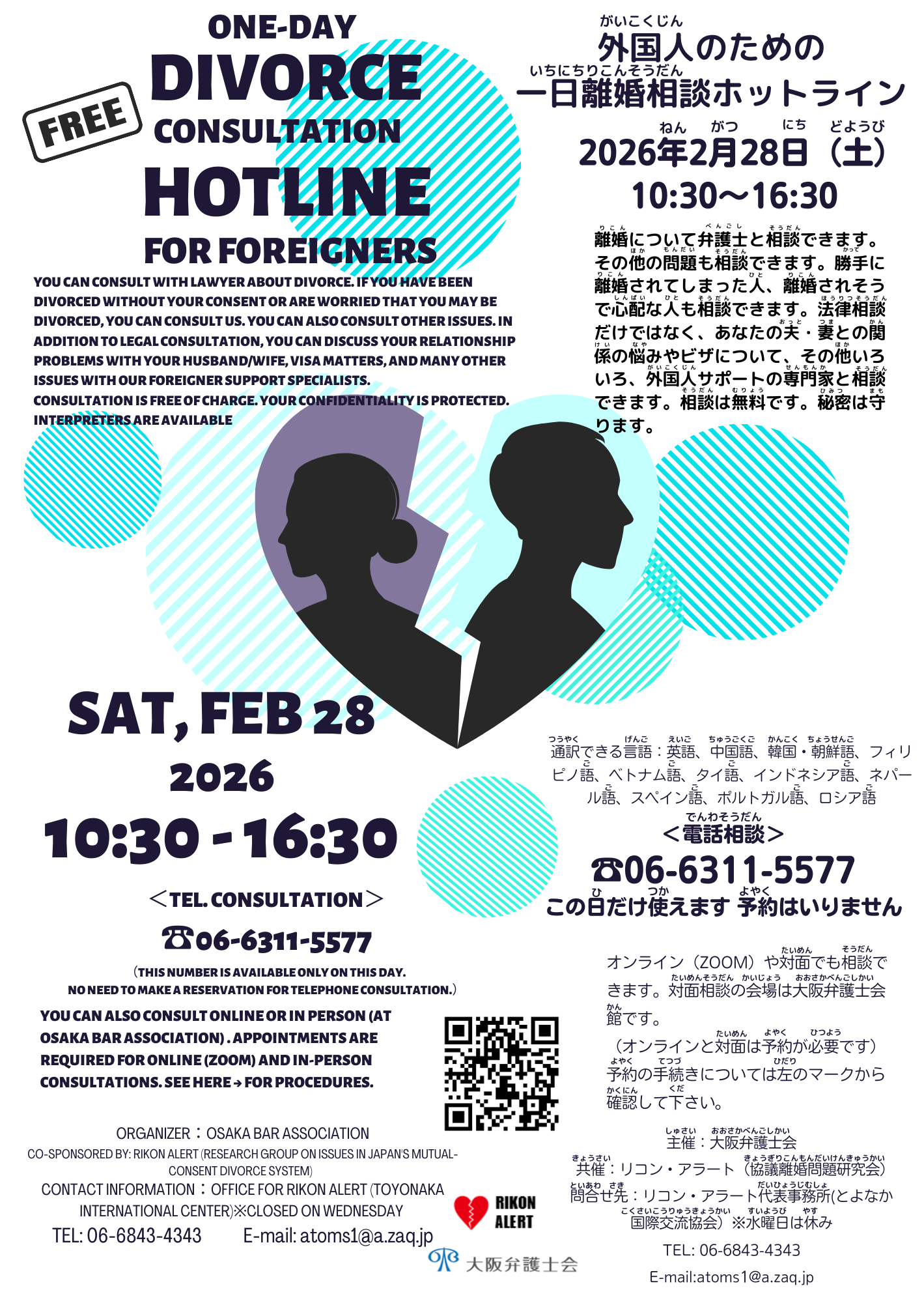 TEL: 06-6843-4343 E-mail: atoms1@a.zaq.jp You can also consult online or in person (at osaka bar association) . Appointments are required for online (ZOOM) and in-person consultations.