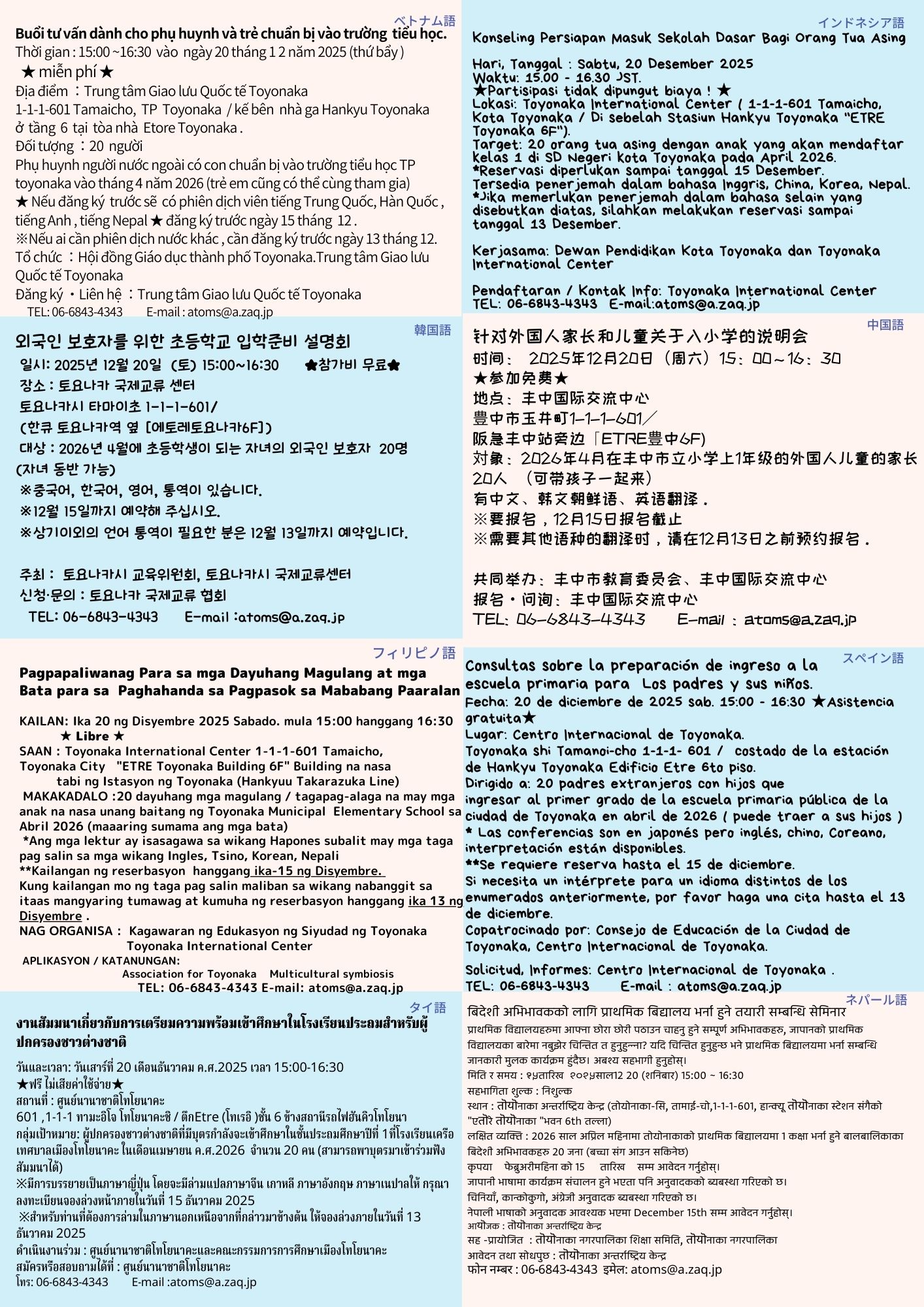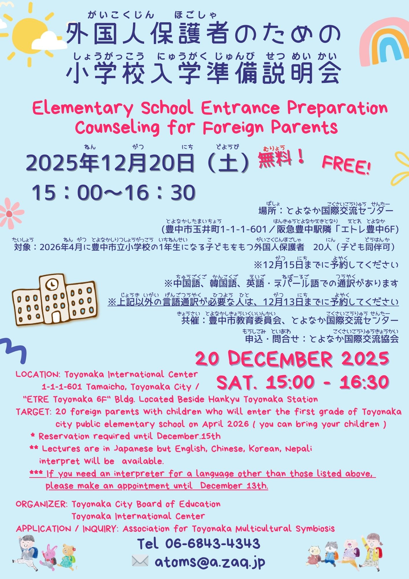 | 連絡先 | とよなか国際交流(こくさいこうりゅう)センター tel: 06-6843-4343 atoms@a.zaq.jp(水曜休館) |