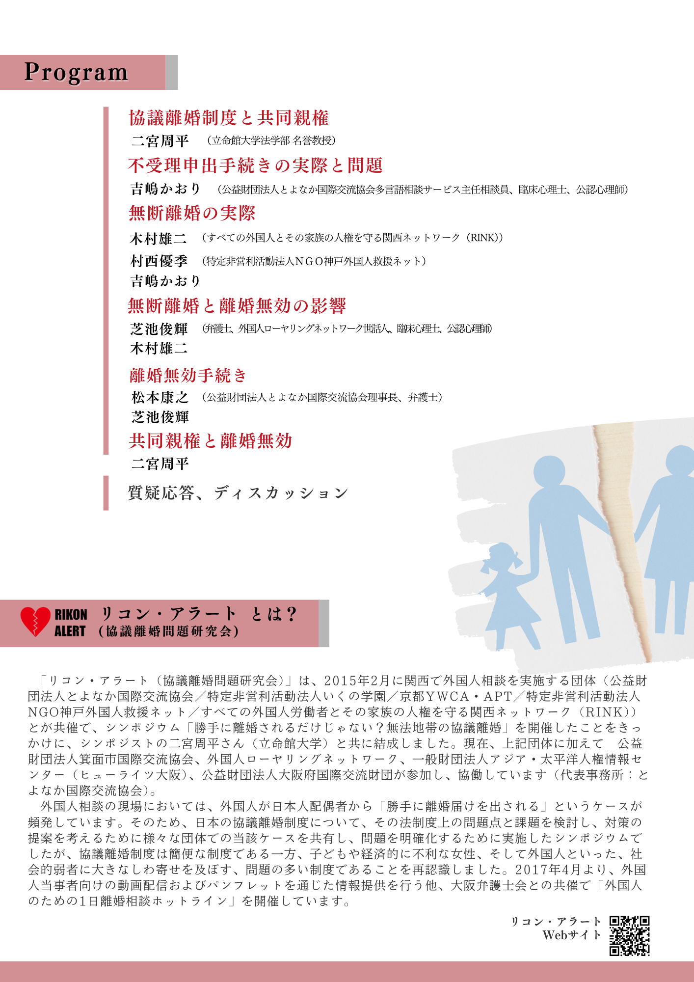このセミナーでは、無断離婚を取り巻く法制度とその実務について取り上げます。国際結婚家族だけでなく、日本国籍家族の支援にも役立つ内容で、支援者として必須の情報です。