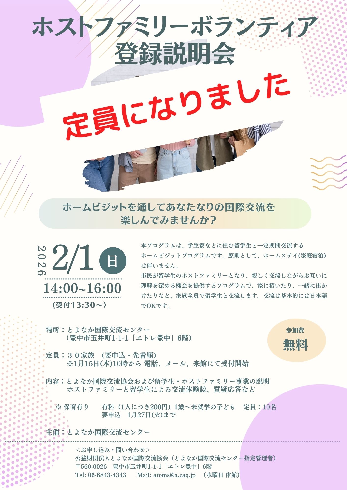 | 連絡先 | 公益財団法人とよなか国際交流協会(とよなか国際交流センター指定管理者) 〒560-0026 豊中市玉井町1-1-1「エトレ豊中」6階 Tel: 06-6843-4343 Mail: atoms@a.zaq.jp (水曜日 休館) |