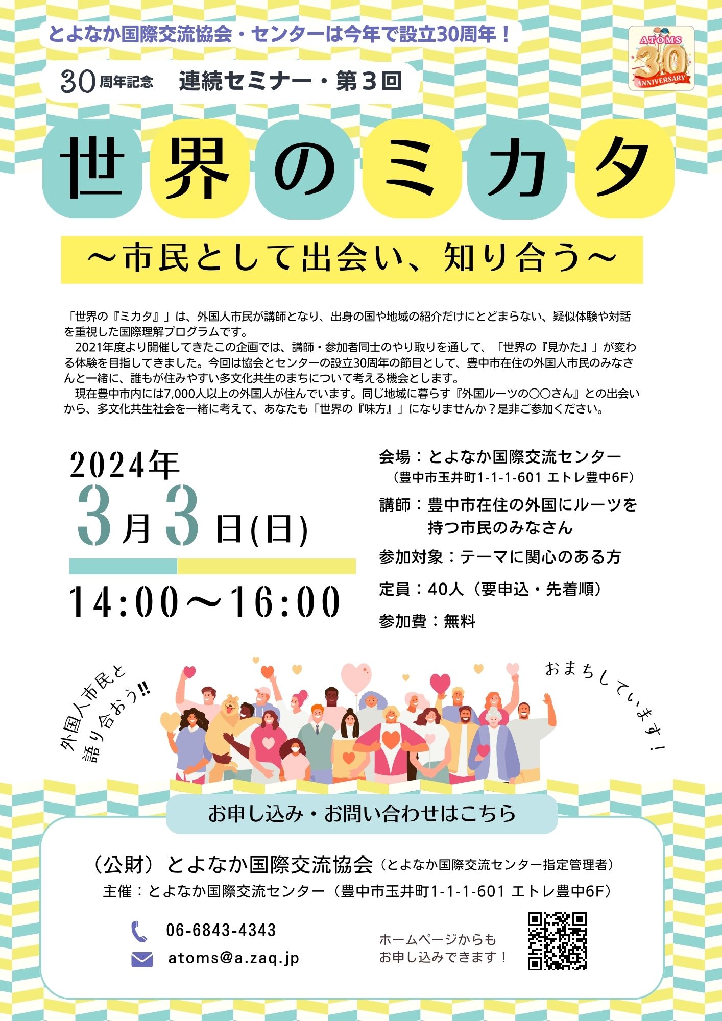 30周年記念 連続セミナーの第3回として、「世界のミカタ ~市民として出会い、知り合う~」を開催します。豊中市在住の外国人市民のみなさんと一緒に、誰もが住みやすい多文化共生のまちについて考える機会とします。