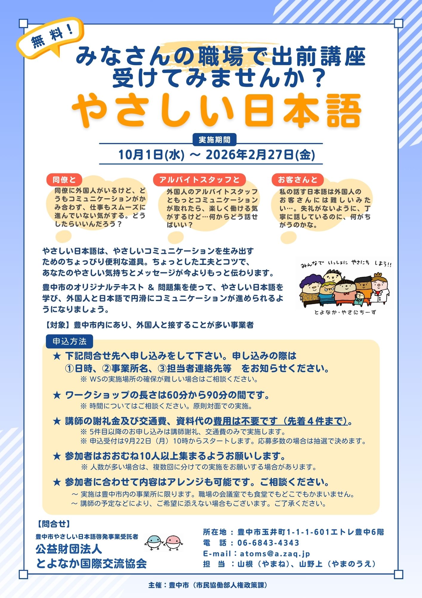 豊中市やさしい日本語啓発事業の一つとして、豊中市内にあり、外国人と接することが多い事業者を対象に、「やさしい日本語」の出前講座を実施します。申込先着4件までは無料で実施いたします。