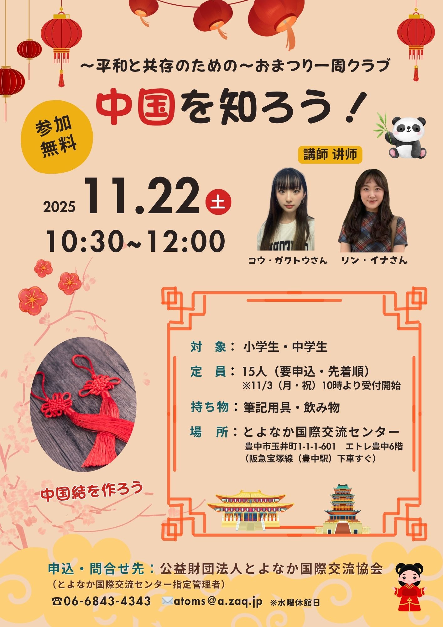 中国出身の講師から母国に関するお話を聞いたり、遊んだりする小・中学生向けの国際理解プログラムです。※保護者は最後30分のみ見学ができます。